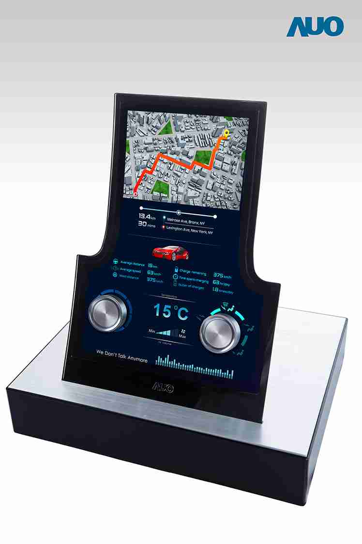 12.3 寸 Full HD LTPS 显示屏同样具备 1000 nits 高亮度,,搭载内嵌式触控技术,,整合驱动与触控 IC 于显示屏制程,,使显示屏厚度降低,,,,为中控台创造更多机构设计空间。。。应用于抬头显示器的 3寸 LTPS 显示屏具有高穿透率、、、、1200:1 高对比度度,,,,以及 297 PPI 高画素密度。。。液晶最高可耐受到 110C 的高温 (TNI) 而不液化,,,,在阳光高温下维持优异稳定的显示效果。。。。
