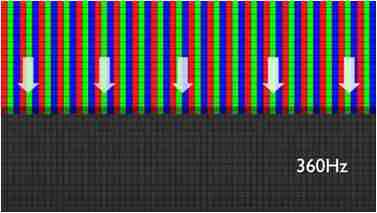 传统液晶驱动是从左到右单向进行,,,在画面更新速度愈来越愈快的情况下,,位于驱动线路末端的右下角区域,,,,画素的闸极来不及在短时间内获得足够电压,,无法显示出正确的颜色资讯。。。。